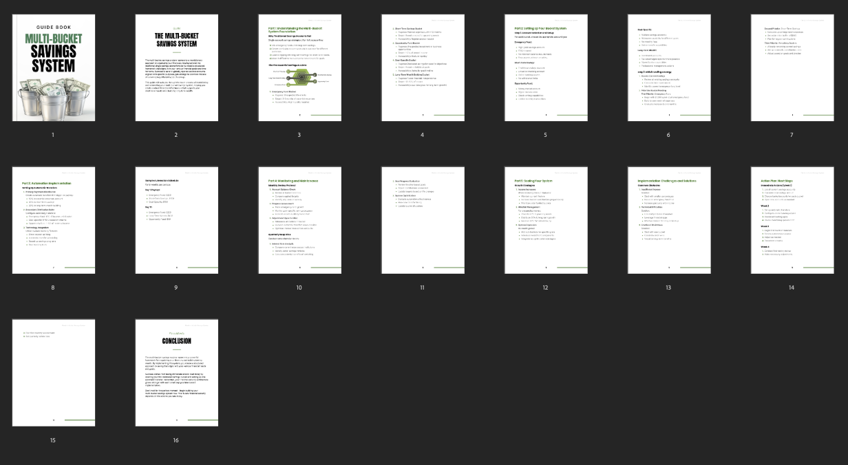 Guide to help your customers create a structured savings system with multiple buckets for short-term needs, emergency funds, and long-term wealth building.